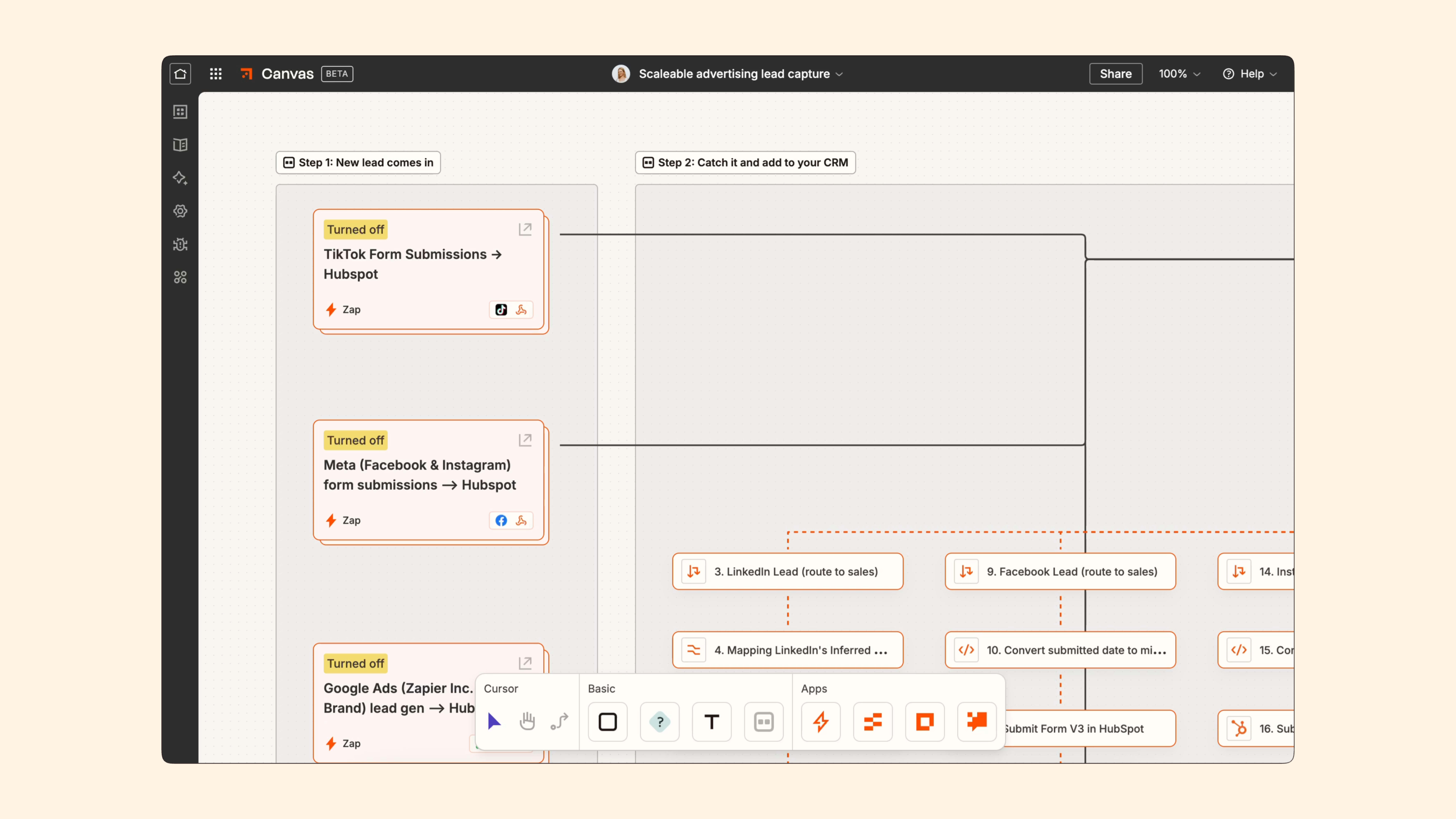 This Zap system breaks down lead capture into individual Zaps for each campaign or channel, making it easier to account for data quirks by platform.